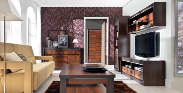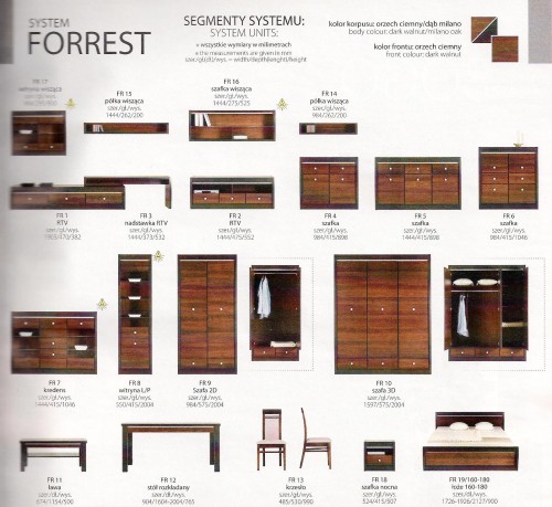 Przykładowy zestaw mebli - MONTAŻ GRATIS. Kolor korpusu orzech ciemny/ dąb milano, kolor frontu orzech ciemny, górne wieńce wykończone listwą MDF, krawędzie oklejone obrzeżem PCV, płyta wiórowa melaminowana (gr. 18 mm i 22 mm). Wiele modułów umożliwiających stworzenie ciekawych aranżacji m.in. komody, szafy, półki, witryny, łóżka różnej szerokości, krzesła, stół rozkładany, ława, szafki nocne, łoża tapicerowane.