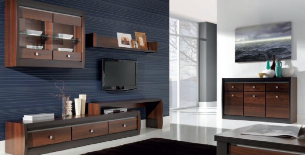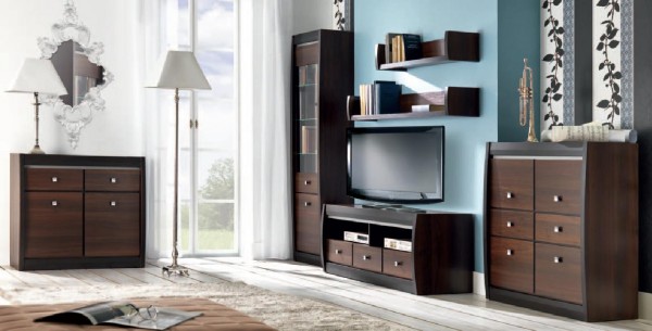 Przykładowy zestaw mebli - MONTAŻ GRATIS. Kolor korpusu orzech ciemny/ dąb milano, kolor frontu orzech ciemny, górne wieńce wykończone listwą MDF, krawędzie oklejone obrzeżem PCV, prowadnice metalowe rolkowe, uchwyty metalowe. Wiele modułów umożliwiających stworzenie ciekawych aranżacji m.in. komody, szafy, półki, witryny, łóżka różnej szerokości, krzesła, stół rozkładany, ława, szafki nocne, łoża tapicerowane.