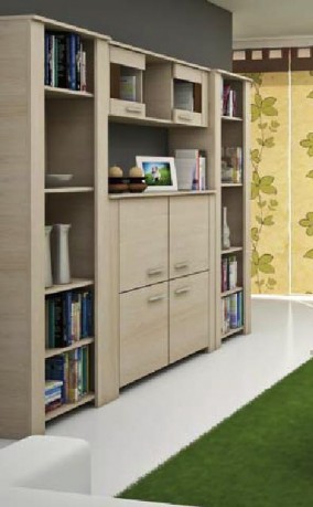 a kolory frontów to klon linberg + wenge (aplikacje frontów). Meble wykonane z płyty wiórowej melaminowanej o grubości 18 mm, krawędzie oklejone obrzeżem PCV, w witrynach front ramkowy z bezpiecznym hartowanym szkłem, prowadnice rolkowe z samozamykaczem w szufladach. System charakteryzują proste linie, ciepłe, jasne odcienie oraz funkcjonalność.