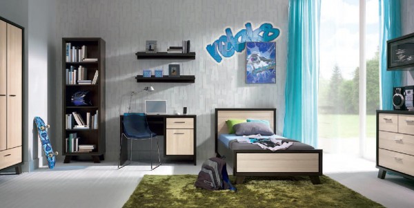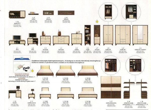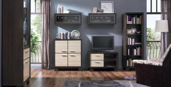 Przykładowy zestaw mebli - montaż GRATIS. Kolor korpusu jesion thermo, kolor frontu jesion coimbra. Dużo modułów umożliwiających wiele aranżacji m.in. stolik RTV, komody, szafy, łóżka, półki, witryny. Ciekawe połączenie ciemnych korpusów z jasnymi frontami.