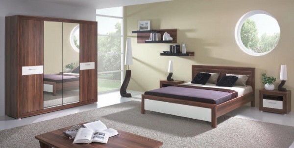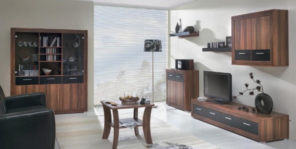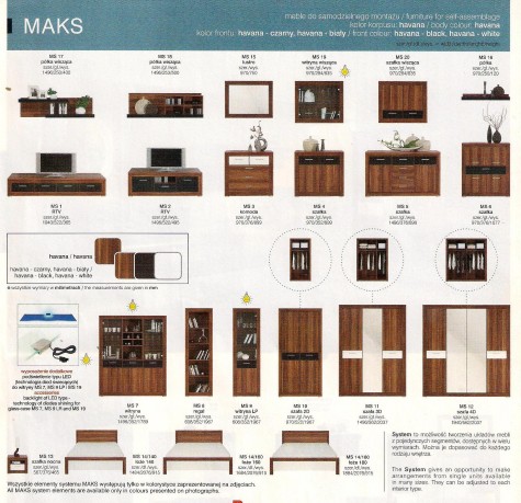 Przykładowe zestawienie elementów - MONTAŻ GRATIS. Kolor korpusu havana, kolor frontu havana/czarny lub havana/biały. Dużo modułów w wielu wymiarach m.in. komody, witryny, regały, szafki, łóżka, półki, szafki nocne, witryny wiszące. Do witryn można zamówić oświetlenie typu LED.