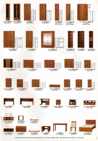 Przykładowy zestaw elementów - MONTAŻ GRATIS. Kolor korpusów i frontów to orzech. Meble wykonano z płyty wiórowej melaminowanej (gr. 18 mm i 22 mm) wykończonej techniką soft, ścianki tylne z płyty HDF (gr. 3 mm), fronty wykonane z MDF-u pokrytego wysokogatunkową folią w kolorze orzecha, regulowane nóżki, poszczególne elementy połączono kołkami i złączami mimośrodowymi. W niektórych elementach istnieje możliwość wyboru oświetlenia wewnętrznego. Dużo modułów pozwalających na stworzenie ciekawych aranżacji zarówno w małym jak i dużym pomieszczeniu.