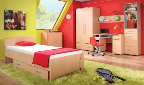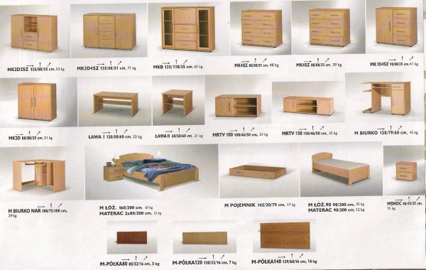 Przykładowy zestaw elementów - MONTAŻ GRATIS. System można zamówić w następujących kolorach: buk, grusza, olcha; poszczególne elementy połączono kołkami i złączami mimośrodowymi. Wiele elementów pozwalających na stworzenie ciekawych aranżacji m.in. komody (gł.35 cm lub 51 cm), regały, szafy, biurka, półki, witryny, łóżka, ławy itd.
