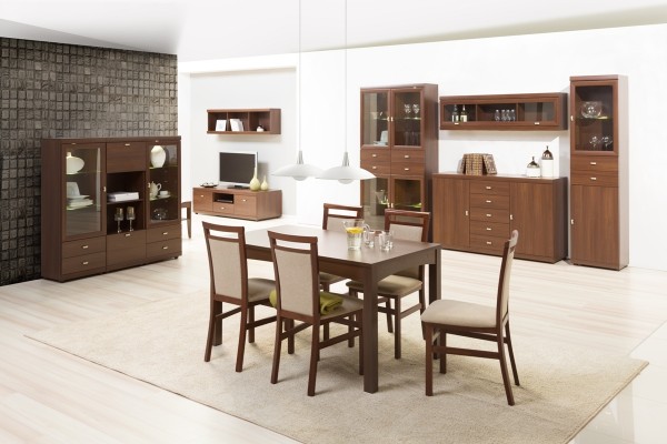 Przykładowe zestawienie elementów - MONTAŻ GRATIS. Kolekcja stworzona w dwóch kolorach: wiśnia malaga oraz akacja królewska. Meble wykonane z płyty laminowanej odpornej na wysoką temperaturę i zarysowania. System składa się z 33 elementów pozwalających stworzyć niepowtarzalną aranżację jadalni, sypialni, pokoju dziennego, gabinetu czy pokoju młodzieżowego. Ciekawym rozwiązaniem wykorzystanym przy wykończeniu łóżka oraz stołu jest frezowanie profilowe.
