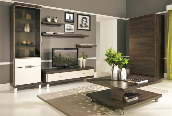 Przykładowe zestawienie mebli - MONTAŻ GRATIS. Kolor korpusu arusha wenge, kolor frontu arusha wenge+biały krem. Nowoczesny system posiadający dużo elementów umożliwiających wiele aranżacji m.in. regały, witryny, szafki RTV, półki. Do witryn można zamówić podświetlenie typu LED (technologia diod świecących).
