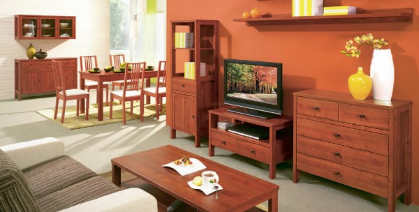 Przykładowe zestawienie elementów - MONTAŻ GRATIS. Kolor korpusu i frontu wiśnia antyczna, płyta wiórowa melaminowana (gr. 18 mm i 22 mm), krawędzie oklejone obrzeżem PCV, nóżki wykonane z MDF-u, poszczególne elementy połączono kołkami i złączami mimośrodowymi. Dużo modułów w wielu wymiarach m.in. komody, regały, witryny, łóżka, lustra, szafki, ławy.