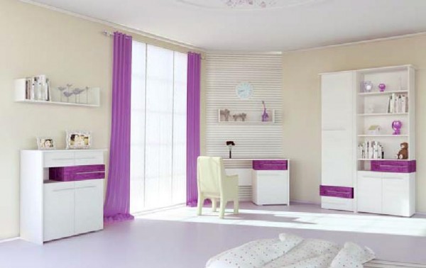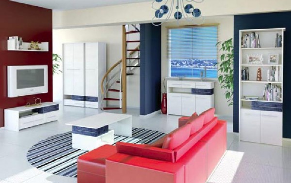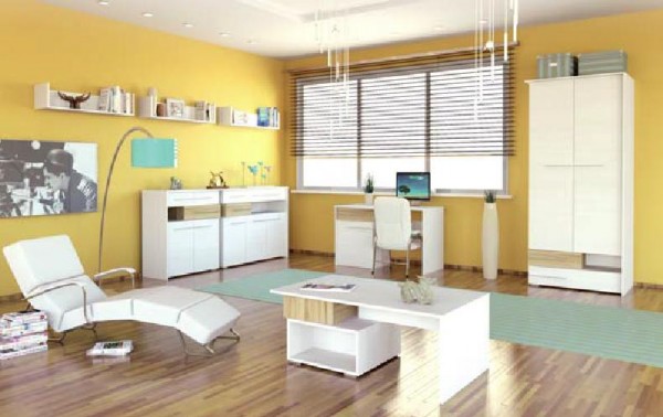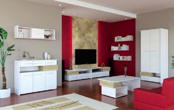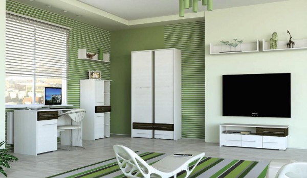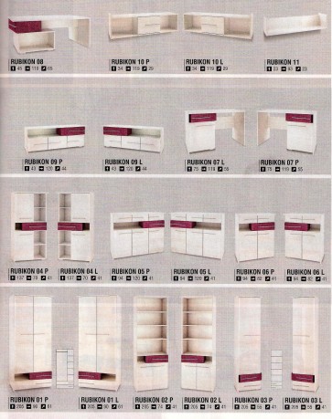 Przykładowe zestawienie elementów - MONTAŻ GRATIS. Kolorystyka systemu: kolor korpusów: navarra, kolory frontów: navarra + wstawki tapicerowane w szufladach w kolorze wrzos, niebieskim lub szarym. Szuflady mogą być wykonane również z płyty meblowej w kolorze buk rdzeniowy lub oliwka sewilla. Meble wykonano z płyty wiórowej melaminowanej o grubości 18 a krawędzie oklejono obrzeżem PCV, poszczególne elementy połączona kołkami i złączami mimośrodowymi. Meble wyprodukowano z płytę navarra z białym wyraźnie widocznym i wyczuwalnym usłojeniem charakterystycznym dla drzew z gatunku iglastych. Natomiast dodatki, jakimi są wstawki dostępne aż w pięciu wybarwieniach dopasują się idealnie do każdego wnętrza. Charakterystyczną cechą tego systemu są wstawki w obiciach tapicerskich oraz możliwość ich montażu na różne sposoby.