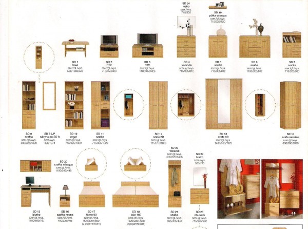 Przykładowe zestawienie mebli - MONTAŻ GRATIS. Kolor korpusu i frontów wiśnia cornvall, płyta wiórowa melaminowana (gr. 18 mm), krawędzie wykończone techniką soft, zawiasy puszkowe z możliwością regulacji. Wiele elementów umożliwiających stworzenie ciekawych aranżacji: komody, regały, witryny, szafy, łóżka, półki, lustro, szafki na buty.