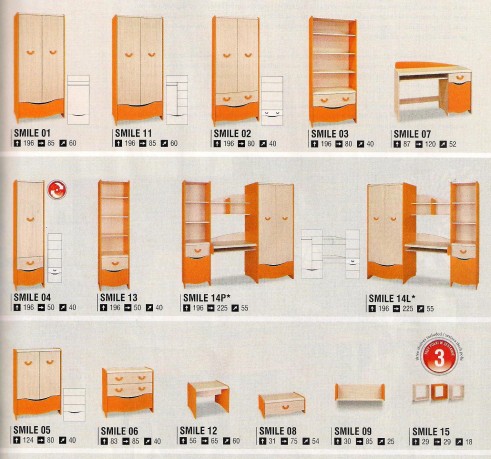 Przykładowe zestawienie elementów - MONTAŻ GRATIS. Kolorystyka systemu: korpusy dąb mleczny a fronty lemon + dąb mleczny lub orange + dąb mleczny. Meble wykonane z płyty melaminowanej o gr. 18 mm, krawędzie wykończone obrzeżem PCV, zaokrąglone bezpieczne narożniki mebli, zawiasy puszkowe z możliwością regulacji, prowadnice metalowe. System dziecięcy SMILE to propozycja dla najmłodszych domowników posiadających już własne pokoje. Często są to pierwsze meble dziecka, które z powodzeniem będą mu służyły przez długie lata. Zaokrąglone narożniki sprawią, że małe dzieci pozostają całkowicie bezpieczne podczas codziennych zabaw.