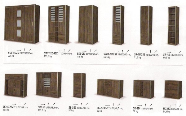 a fronty można zamówić w kolorze dąb canterbury lub dąb santana. Meble wykonane z płyty wiórowej melaminowanej o grubości 18 mm i 28 mm, zawiasy puszkowe z możliwością regulacji. System składa się z wielu elementów co daje możliwość ciągłych zmian i modyfikacji w ich zestawieniu.