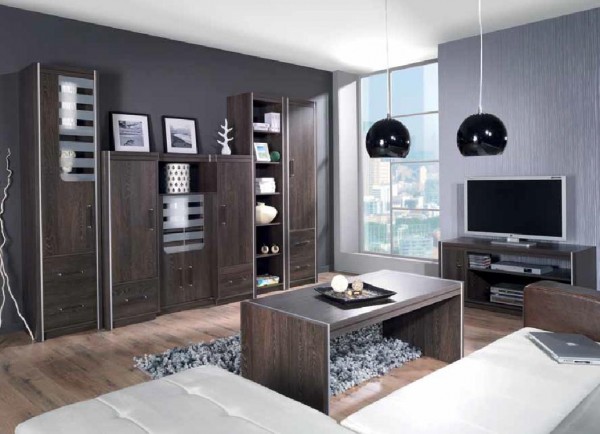 a fronty można zamówić w kolorze dąb canterbury lub dąb santana. Meble wykonane z płyty wiórowej melaminowanej o grubości 18 mm i 28 mm. System składa się z wielu elementów co daje możliwość ciągłych zmian i modyfikacji w ich zestawieniu.