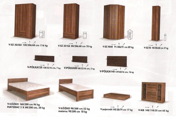 Przykładowe zestawienie elementów - MONTAŻ GRATIS. Meble można zamówić w kolorze śliwa i wenge, płyta wiórowa laminowana (gr. 18mm) częściowo wykończona PCV. Dużo modułów umożliwiających stworzenie wielu układów m.in. komody (gł. 35 cm lub 53 cm), regały, stoliki RTV, szafy, łóżka, biurka, ławy, półki, szafa narożna.