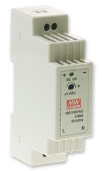 Wymiary 25 x 93 x 56 mm. Napięcie wejściowe dla tego modelu zasilacza impulsowego wynosi 90 - 264 V AC. Napięcie wyjściowe 24 V DC. Zabezpieczenie zasilacza jest przepięciowe tj. występuje opcja odcięcia napięcia wejściowego oraz przeciążeniowe - 105 - 160% mocy wyjściowej znamionowej. Montaż na szynę DIN, znamionowy prąd wyjściowy 0,63 A. Moc znamionowa wynosi 15 W.