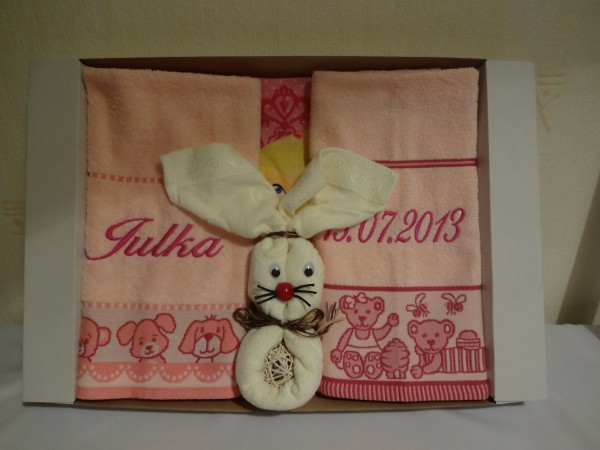 Zestaw ręczników na prezent z komputerowym haftem imienia dziecka i daty urodzenia. W zestawie znajdują się 2 ręczniki o wym 50 x 70 cm, 1 w kolorze ecru 70 x 140 cm i 1 ułożony w zajączka 0 wym. 30x50 cm.
