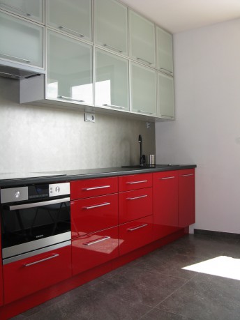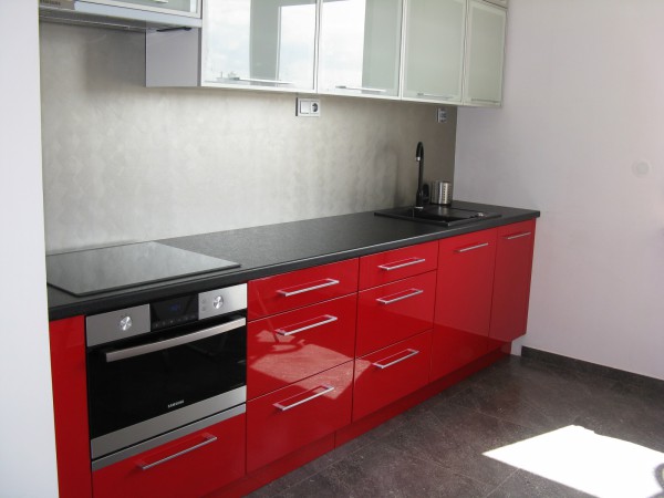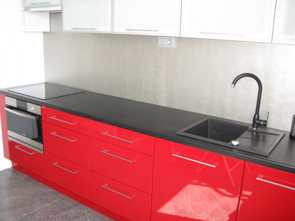 Połączenie czerwonego połysku z czarnym blatem Vulcano oraz ramki aluminiowej ze szkłem matowym.