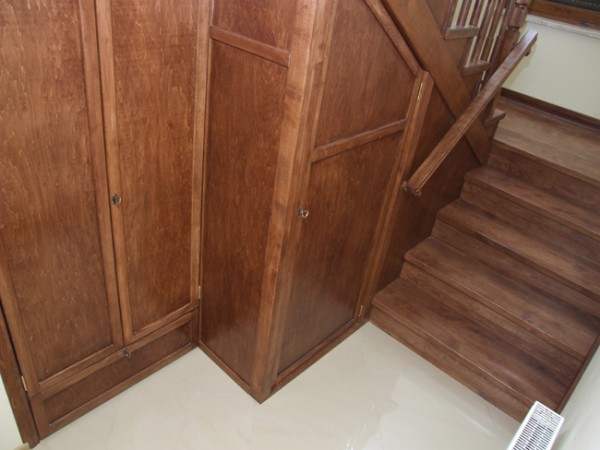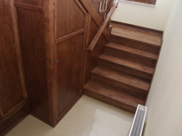 Schody drewniane, bukowe, bejcowane na kolor ciemnego merbau. Osadzone na drewnianej konstrukcji nośnej. Przestrzeń pod nimi, została zagospodarowana jako schowek gospodarczy/garderoba. Wewnątrz zabudowy zamontowano półki i szuflady. Cała konstrukcja pozwala na zaoszczędzenie sporej ilości wolnej przestrzeni w mieszkaniu.