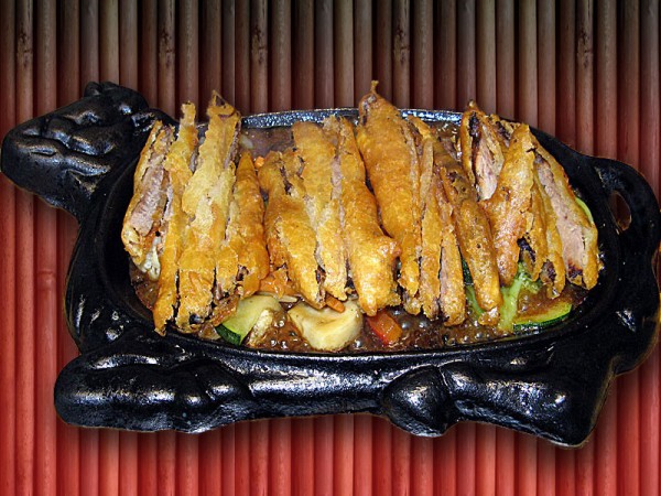 Kaczka po pekińsku zasmażana na świeżych warzywach w zestawie z ryżem i surówką z białej kapusty.Podawana na gorącym półmisku.