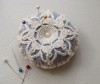 Ręcznie wykonane igielniki to poduszeczki do przechowywania igieł czy szpilek. Świetnie wygladają jako ozdoba powieszona na klamce lub kluczyku od komody. Ozdobione koronką szydełkową.