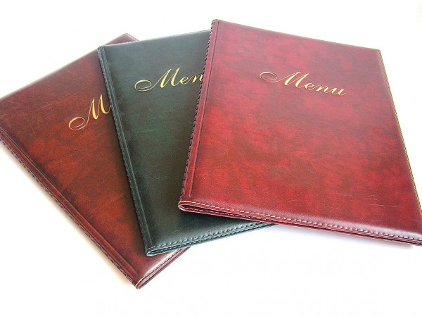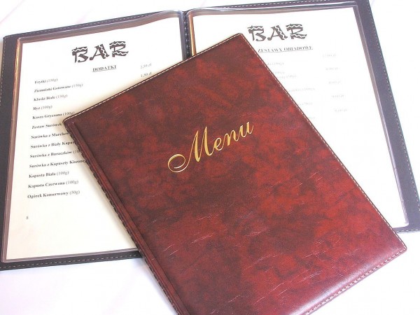 Oferujemy wykonanie okładki na karty dań "Menu" w formacie A4 z dziesięcioma wkładami na karty dań (20 stron). Wykonane są z wysoko przeźroczystej folii PCV. Podklejenie pianką powoduje, że okładka jest miękka i przyjemna w dotyku, a obszycie nicią w kontrastowym kolorze oprócz wzmocnienia dodaje jej subtelnej elegancji. Doskonale spełni swoją rolę w eleganckiej restauracji, jak i w niewielkim barze - ładne i trwałe. Przewagą folii PCV nad skórą lub wyrobami introligatorskimi jest łatwe utrzymanie obwoluty w czystości - wystarczy umyć wodą. Okładka A4 ma wymiary 324x245 (złożona). Okładki dostępne w kolorach bordo, brąz, czarny oraz zielony. Wykonujemy nadruki na zamówionych okładkach. Szczegóły do uzgodnienia. Na zamówienie możemy wykonać okładki w innych kolorach.