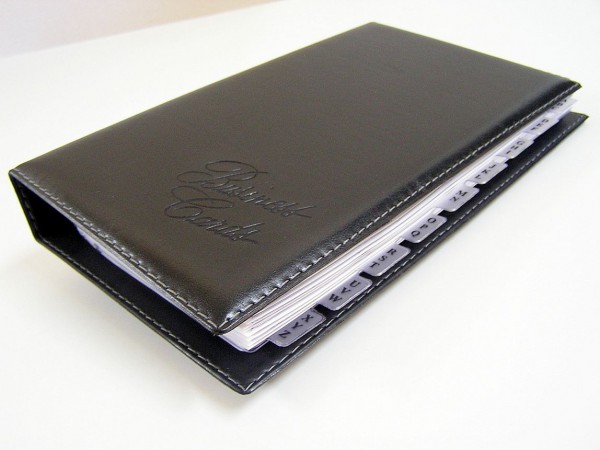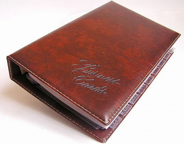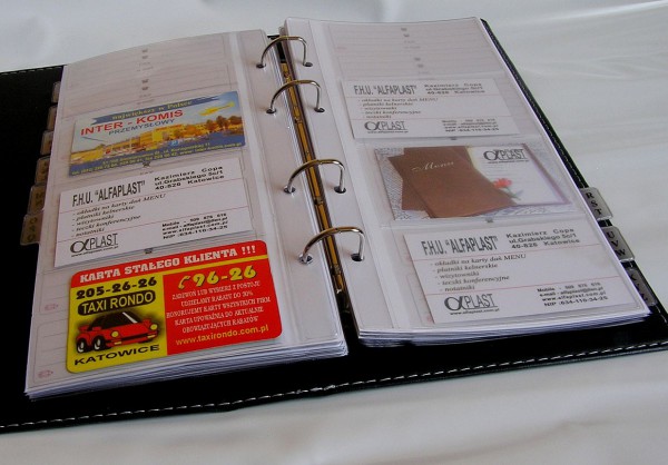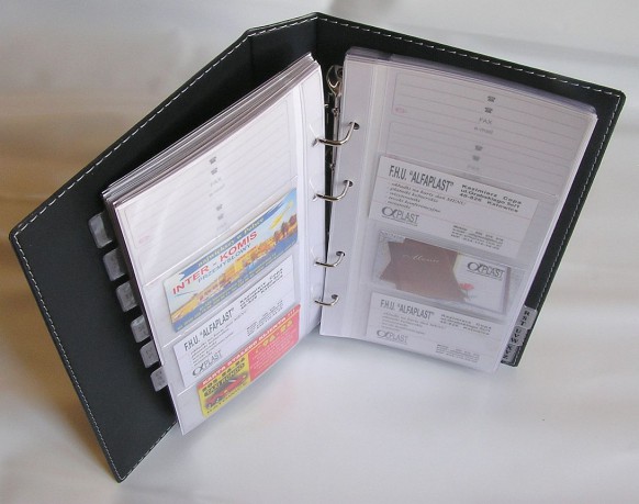 Klaser na 200 wizytówek ze skorowidzem jest najbardziej rozbudowanym wizytownikiem w naszej kolekcji. W środku znajdziemy koszulki do umieszczenia wizytówek, skorowidz literowy od A do Z oraz kartki z eleganckiego papieru do zapisywania danych teleadresowych (e-mail, fax, telefony, adres). Koszulki i kartki wpięte są na mechanizmie pierścieniowym pozwalającym na dołożenie kartek lub koszulek. Mocowanie takie pozwala również na dowolną konfigurację wizytownika. Wizytownik jest obszywany nicią co dodaje mu subtelnej elegancji.