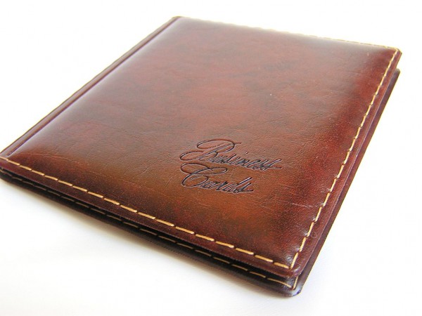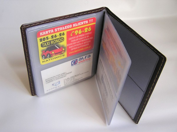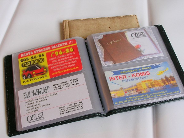 Klaser na wizytówki doskonale mieści się w damskiej torebce. W środku znajdziemy 12 dwu-klatkowych koszulek na wizytówki. Wizytownik obszyty jest nicią w kontrastowym kolorze.