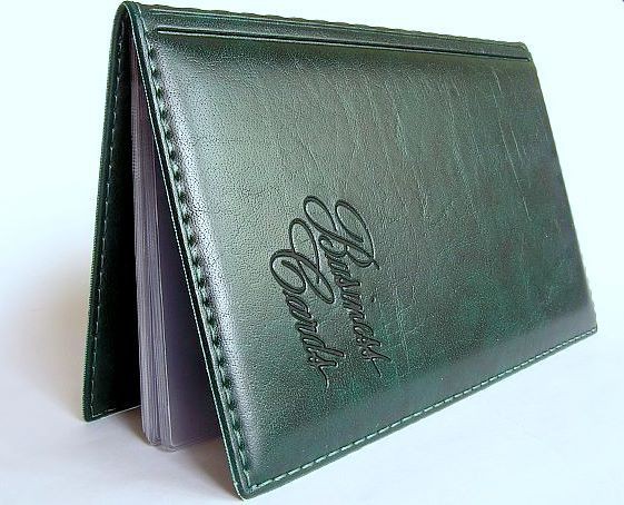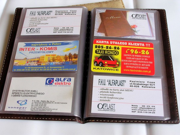 Wizytownik na 72 wizytówki produkowany jest w wersji tańszej z folii PCV oraz obszywany nicią. W środku znajdziemy 12 trzy-klatkowych koszulek mogących zmieścić 72 wizytówki. Cena wizytownika z folii PCV 10 zł. Cena wizytownika obszywanego nicią 14 zł.