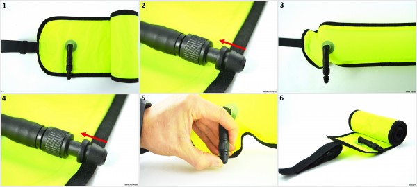 3. Po wdmuchaniu odpowiedniej ilości powietrza odsunąć boję od ust oraz wysunąć czarną końcówkę zaworu dodawczo-upustowego. Boja jest gotowa do użycia (zdj.3).