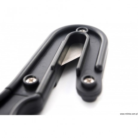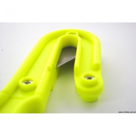 Żółty nóż hakowy do cięcia sieci z kaburą.