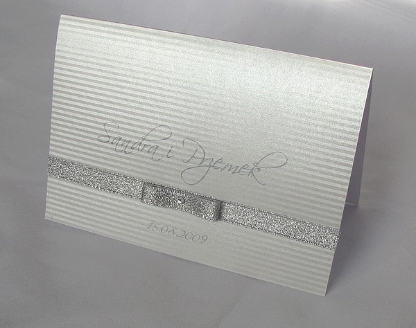 Zaproszenia na grubym srebrnym papierze w delikatne prążki, ze srebrną wstążką i cyrkonią.