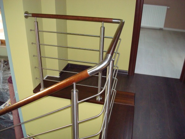 Balustrada nierdzewna łączona z drewnem. Słupki - stal nierdzewna szlif , poręcz - drewno buk bejcowany, wypełnienie pięć prętów fi 10.
