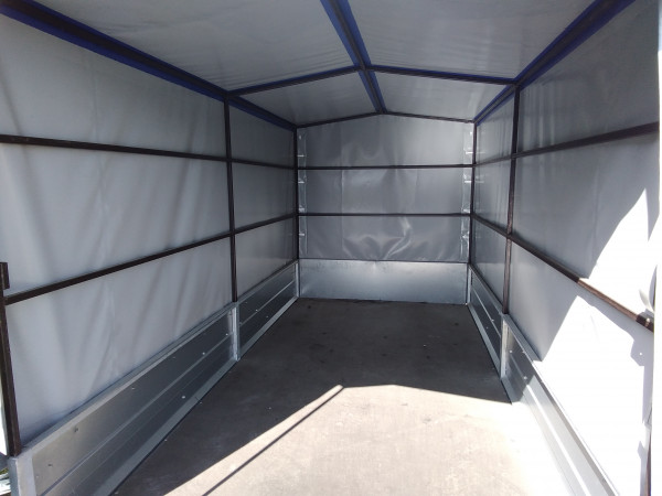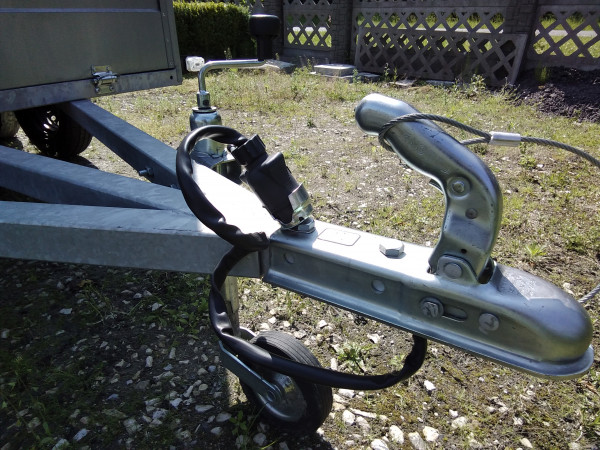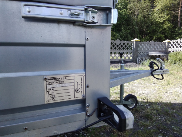 Przykładowa przyczepa dwuosiowa na ośkach skrętnych 2X750 kg KNOTT. Rama przyczepy wykonana jest z profili zamkniętych, cynkowana ogniowo. Na podłodze sklejka antypoślizgowa wodoodporna, burty z wysoko tłocznej blachy MAGNELIS. Plandeka ze stelażem. Zaczep KNOTT 1400 kg.