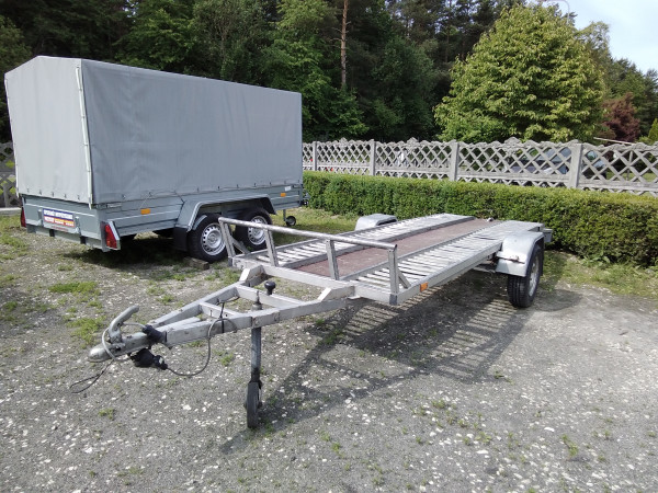 Wypożyczamy przyczepy lekkie jednoosiowe o długości od 2,2 m do 2,5 m i szerokości 1,3 m oraz lekkie dwuosiowe o długości 3 m i szerokości 1,5 m, przyczepę ze stelażem do przewozu motoru, lawetę lekką bez burt o powierzchni ładunkowej 3,5 m. Wszystkie przyczepy posiadają DMC do 750 kg tzn. nie wymagają dodatkowych uprawnień do prowadzenia.