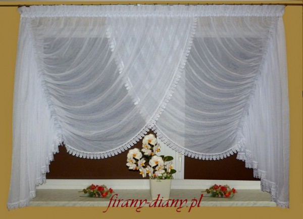 Firana z białego delikatnie kreszowanego woalu. Obie części uszyte są razem na jednej taśmie marszczącej typu smok. Boki ozdobione taśmami pionowego marszczenia ładnie się układają. Góra firanki wykończona kryzą zasłaniającą żabki lub haczyki. Boki i dół firany zostały obszyte gipiurą o szer. 6 cm.