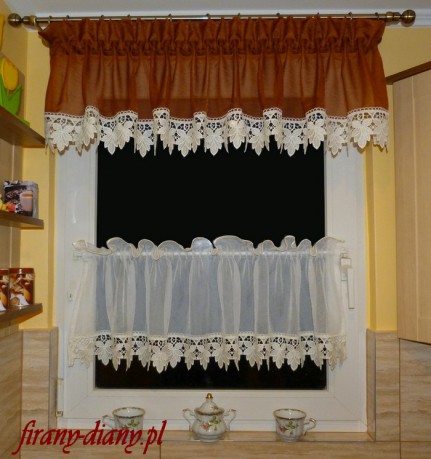 Zazdroska uszyta z woalu kreszowanego . Dolna część firanki w kolorze ecru wykończona gipiurą o szer. 10 cm, górna firanka w kolorze brązowym z gipiurą ecru. Góra firanki uszyta na taśmie marszczącej typu smok o szer. 5 cm, można wieszać na żabki lub haczyki. Dolna część uszyta na taśmie z żyłką na patyczek do zazdrosek.