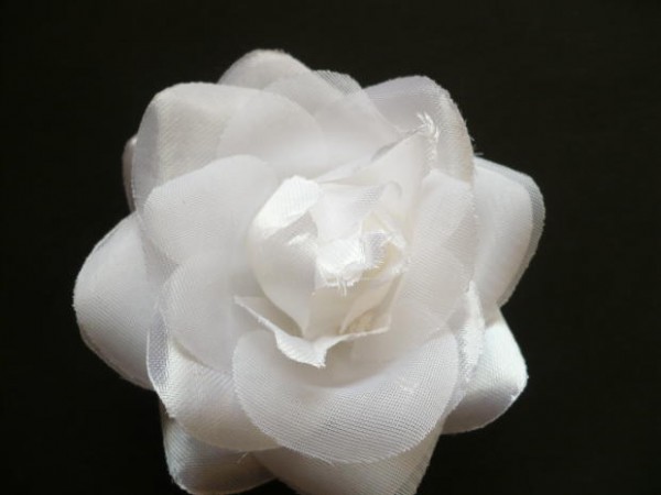 Kwiat biały, średnica 8 cm, mocowanie: broszka + gumka lub klips metalowy