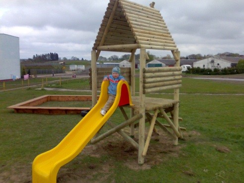 Domek z slizgawka posiada certyfikat, nadaje się na publiczne place zabaw dla dzieci