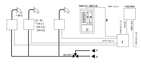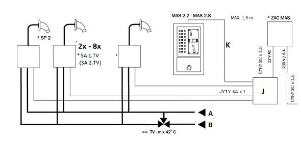 MAS 2 przeznaczony jest do kontrolowania od 2 do 8 kabin prysznicowych. Całkowity czas i opłaty za korzystanie z urządzenia są zaprogramowywane w panelu. Użytkownik dostaje informacje o wyczerpaniu czasu kąpieli i ma możliwość jej przedłużenia poprzez wrzucenie kolejnych monet. Ustawiając program ustalamy czas trwania prysznica oraz czas pozostania w kabinie prysznicowej (standardowo zaprogramowane jest 5 min kąpieli i 10 min zajmowania kabiny prysznicowej; na życzenie klienta panel może być zaprogramowany na inne wartości czasowe). MAS 2 może być wyposażony na zamówienie w licznik monet PM 1.