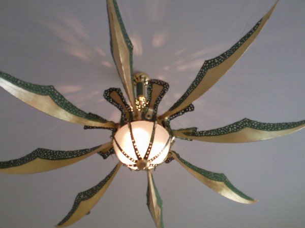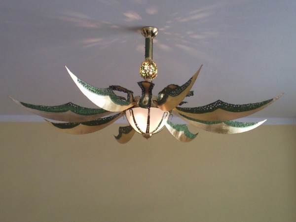 Ręcznie wykonany żyrandol, z pozłacanymi elementami, ozdoba dużych, wysokich pomieszczeń.