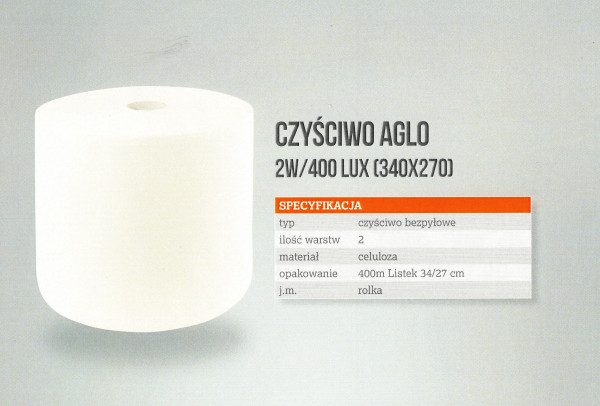 Czyściwo celulozowe, dwuwarstwowe, bezpyłowe. Nawój 400 m na rolce. Wymiary listka: 34/27 cm.
