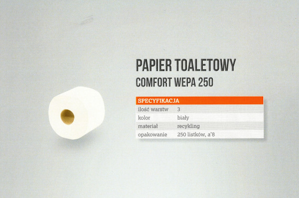 Papier toaletowy Wepa Comfort, mieszanka celulozy i makulatury, trójwarstwowy, biały. 250 listków na rolce. Pakowany po 8 rolek.