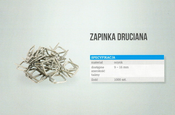 Klamerka druciana ocynkowana dostępna w wymiarach 13 mm oraz 16 mm. Zalecana do taśm polipropylenowych (PP) oraz poliestrowych (PE i PET) o szerokości 12 mm i węższych oraz 15-16 mm.