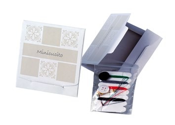 Zestaw różnych nici, igły, agrafki, guziki, w zamykanym opakowaniu papierowym.
