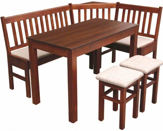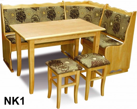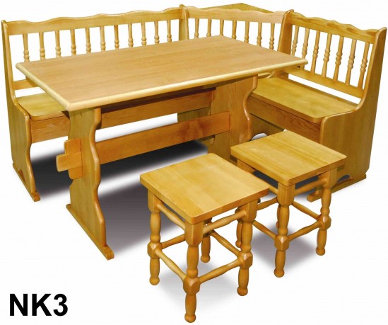 Wykonane z drewna sosnowego narożniki kuchenne ze stołami i taboretami.