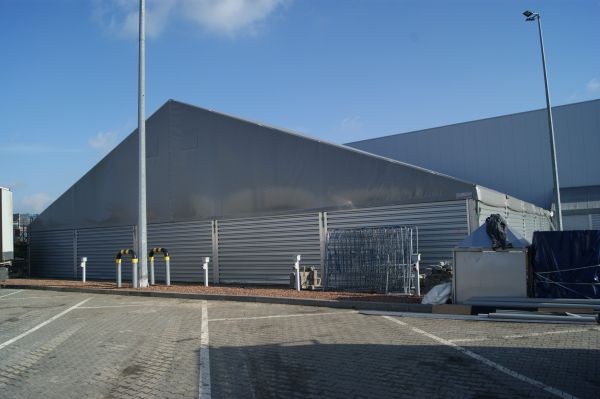 Hala Namiotowe, dach dwuspadowy wykonany z plandeki (materiał PVC), boki - blacha trapezowa T35 o grubości 0,5 mm