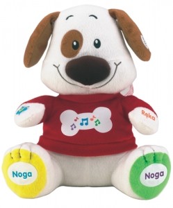Kolorowy piesek mówiący po polsku dziecięcym głosem, sympatycznie uśmiechający się do dziecka, zachęci dziecko do interaktywnej zabawy.