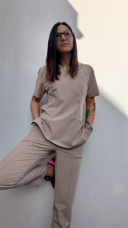 Zestaw składa się z taliowanej bluzy zakładanej przez głowę oraz spodni typu joggery z prostymi nogawkami oraz eleganckim przeszyciem – idealnych dla osób, które cenią sobie profesjonalny wygląd i komfort podczas pracy.
