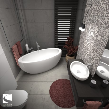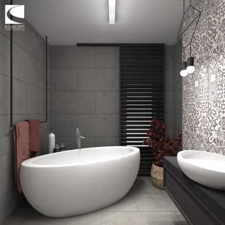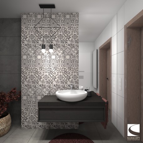 Przestrzeń dająca możliwość odprężenia w wolnostojącej wannie. Wykończenie płytkami hiszpańskiej marki przywodzi wspomnienia z podróży do Maroko. Dodatki w kolorach Marsala sprawiają, że mimo chłodnej kolorystyki płytek łazienka jest przytulna.