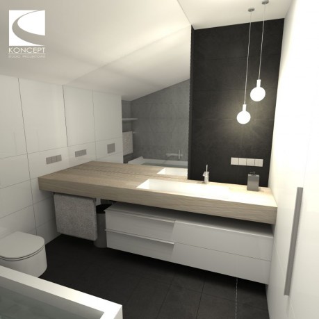 Łazienka dedykowana sypialni wyposażona została w umywalkę, wannę i miskę toaletową. Wiele szaf i szafek pozwala na maksymalne ukrycie wszelkich akcesoriów w meblach.