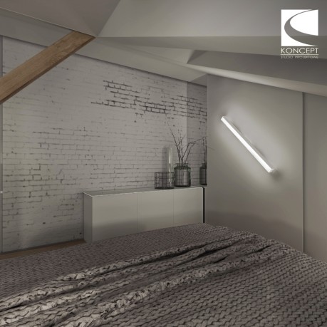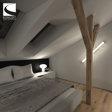 Minimalistyczna sypialnia w bieli i odcieniach szarości ocieplona kolorem naturalnego drewna dębowego.