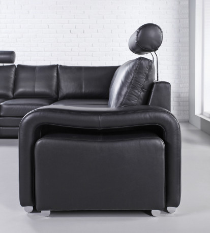 Prostą linię mebli Enzo wzbogacają subtelne przeszycia na oparciach a także chromowane nóżki. Natomiast indywidualny kształt oraz charakter nadają mu praktyczne zagłówki regulowane na wysokość oraz chowane w podłokietnikach narożnika pufy, które mają ogrom zastosowań. Kolekcja Enzo wzbogacona została o praktyczną funkcję spania. Dzięki odpowiedniemu wypełnieniu jest wręcz idealny do wypoczynku po całym dniu pracy, czy przed TV. Perfekcyjne wykonanie, prosty, subtelny kształt sprawiają, że narożnik wygląda wyjątkowo i jest bardzo elegancki.